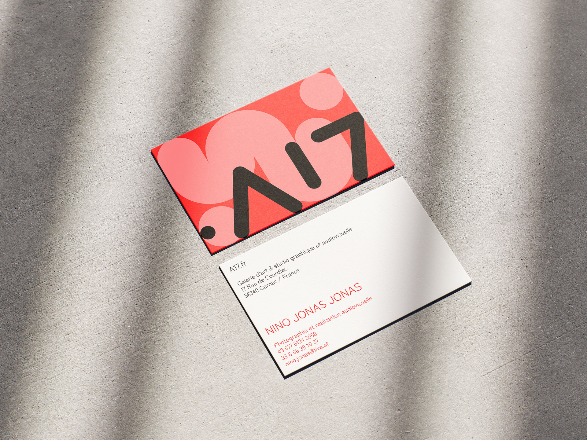 Pour l’image de la galerie, j’ai créé le logo, les cartes de visite et le matériel publicitaire (cartes postales), ainsi que des autocollants que nous avons installés sur la façade. Le nom A17 correspondait à la numérotation de la rue où nous étions installés.