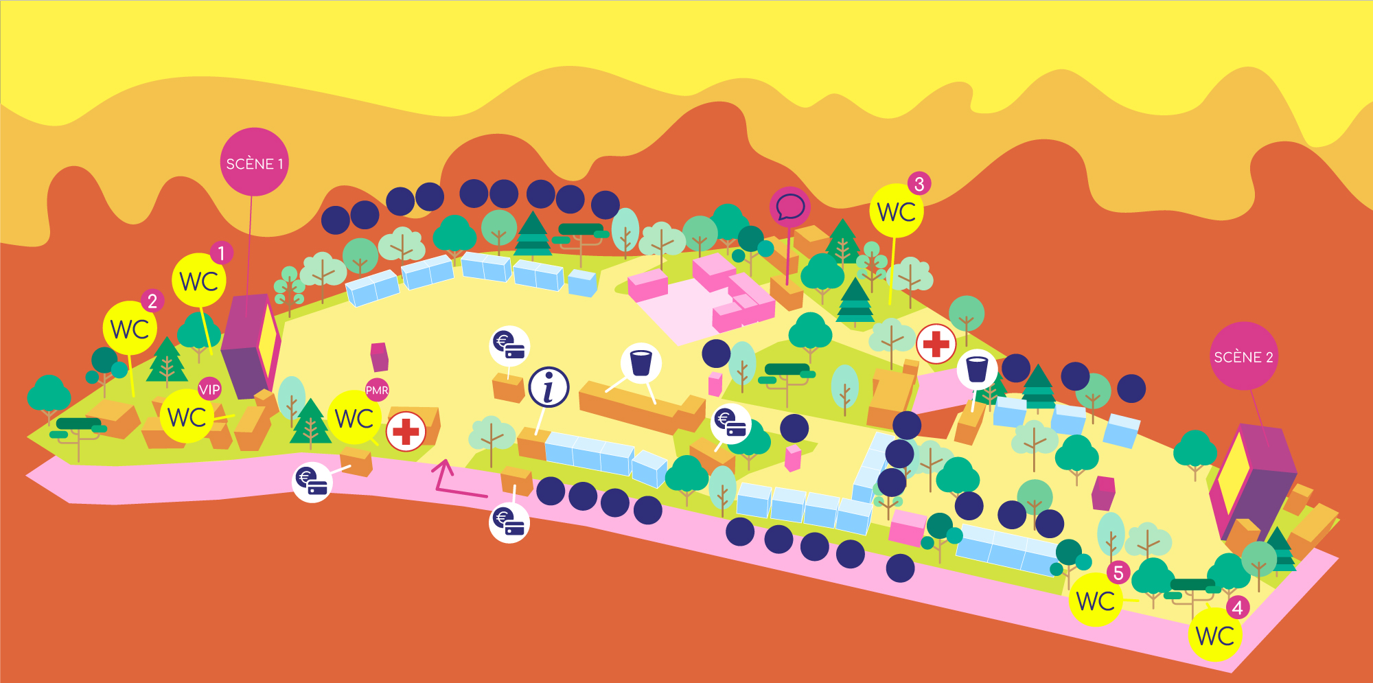 En ce qui concerne la palette de couleurs, nous avons travaillé avec une charte graphique définie, qui chaque année sélectionne une couleur prédominante afin d'apporter une cohésion et une identité visuelle forte à l'événement.